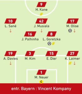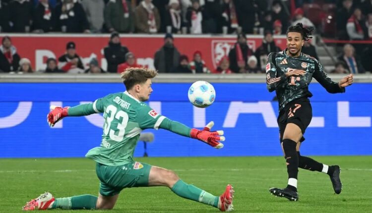 Sané profité d’une grosse erreur de relance du VfB Stuttgart pour lancer en profondeur Musiala. L’Allemand, seul face à Nubel, enroule du pied droit mais pas suffisamment et voit sa frappe fuir le poteau gauche à la 22è.