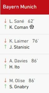 64è, Nubel manque totalement sa relance. Il cherche Stiller avec une passe à ras de terre dans la surface. Goretzka surgit et enchaîne directement du pied gauche pour donner l’avantage aux Bavarois. 1-2 !