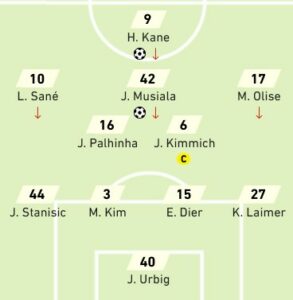 Décalage côté droit pour Olise qui centre pour Kane. L’anglais place une tête plongeante à bout portant et trompe Dahmen.