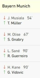 42e, Sané percute côté gauche et centre à ras de terre pour Musiala serré de prêt par Zesiger. Bambi s’arrache pour frapper en pivot et tromper le gardien adverse.