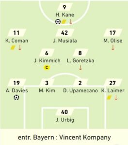 Très long ballon de Kimmich pour Gnabry dans la moitié de terrain adverse. Ce dernier, habilement conserve et ressort le ballon au milieu de 3 défenseurs. S’ensuit une splendide action en triangle, avec Goretzka puis Kane subtilement pour Davies qui fait le break au point de pénalty du gauche à la 71è !