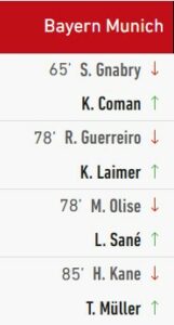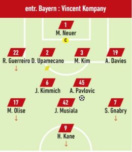 39e, Olise cherche Kane dans la surface. Le ballon renvoyé par Tapsoba dans l’axe revient sur Pavlovic qui reprend de demie volée. Hradecky touche le ballon du poing mais celui-ci finit au fond des filets. Le jeune international se rattrape de sa boulette. 1 à 1 !!