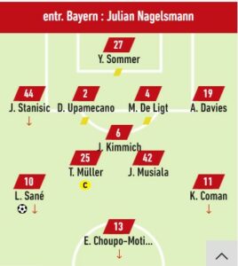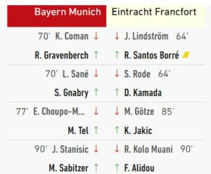 Pourtant en supériorité numérique au départ de l’action, le Bayern concède un contre fulgurant et bien négocié. Kolo Muani dépose Upamecano et croise parfaitement sa frappe pour tromper Sommer. à la 69è.