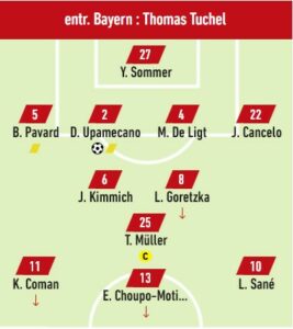 Cette période de domination sera récompensé à la 19è minute par un but d’Upamecano venu placer une tête imparable sur un corner de Kimmich.