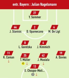 52è, on aurait pu y croire….Musiala adresse un centre pour Choupo qui reprend de la tête. Müller effleure le ballon dans un second temps et le ballon atterrit au fond des filets. Le but est finalement refusé pour un hors jeu de Müller.