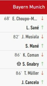 Cancelo, remonte énergiquement le ballon depuis le flanc droit avant de se recentrer et de servir Gnabry. Rentré depuis peu, il cadre et marque d’une belle frappe croisée en glissant à la 89è.