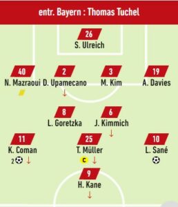 Sané s’enfonce balle au pied à travers les lignes désolidarisées de Fribourg, décale au dernier moment vers Coman qui bute sur Atubolu à la 71è !