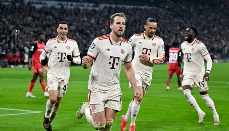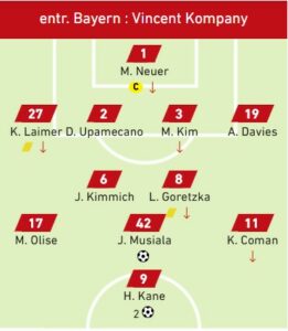 Kane est servi dans l’axe et écarte sur la droite. Olise, devant Hincapié, s’emmène le ballon sur son pied droit avant de centrer. Kane arrive lancé et devance Mukiele pour catapulter le ballon au fond des filets d’une tête parfaite à la 9è.