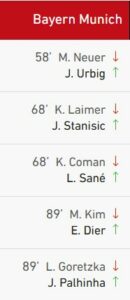 2 faits de jeu : 56è, Neuer cède sa place sur blessure et Mukiele est exclu à la 62è pour un 2è jaune.