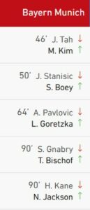 Coup franc pour les bavarois. Il est rejoué après avoir été touché par l’arbitre. Olise est servi à droite et s’applique pour centrer fort devant le but. Sous la pression d’Upamecano, Chalobah dévie du tibia dans ses propres filets.