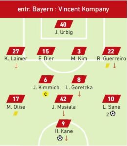Les bavarois ont assuré l’essentiel en s’imposant pour reprendre 6 points d’avance sur Leverkusen. Dominateurs, les Munichois ont profité de plusieurs approximations défensives adverses pour marquer, mais n’ont pas rassuré en défense avec trop de largesses…l’absence d’Upamecano s’est elle fait ressentir ?