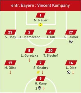 Goretzka récupère le ballon haut et sert Olise qui trouve Kane en première intention dans la profondeur.