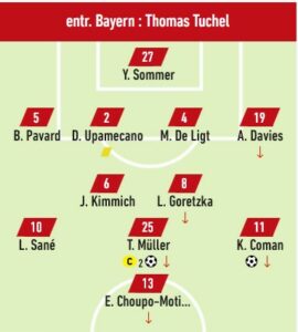 5 minutes plus tard,  Kimmich botte le corner. De Ligt surgit pour mettre un coup de casque. Müller, opportuniste, pousse le ballon sans trop savoir comment au fond des filets. 2 – 0 !!