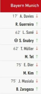 Gnabry effectue son retour de belle manière avec une pseudo madjer talonnade sur un centre de Goretzka. Entre les jambes du gardien ! 6 – 1 !
