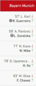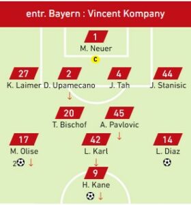 Kane conserve le cuir au milieu et d’une belle ouverture lance Olise qui élimine son vis à vis et cherche Diaz.
