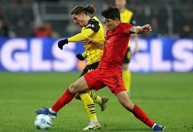 28e, ballon donné par Schlotterbeck le long de la touche à Bynoe-Gittens qui trompe quelque peu naïvement Laimer et accélère.