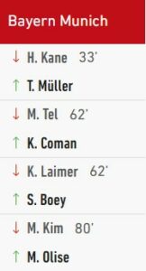 Contre rondement mené par les Munichois. Muller récupère le ballon et passe en taclant pour Laimer qui rentre intérieur, fixe et sert Sané à la dernière seconde. L’ailier se présente dans la surface face à Kobel mais croise trop et ne cadre pas en tirant du droit à la 60è…