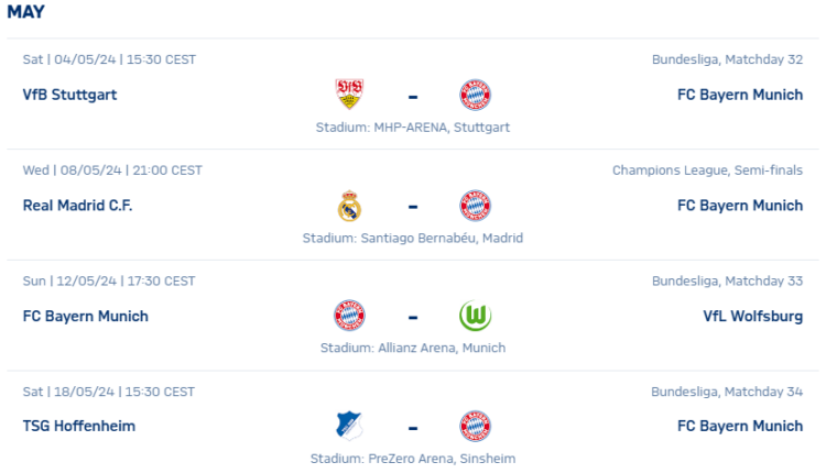 Le calendrier de la fin de saison est presque établi. Un déplacement compliqué à Stuttgart dans le derby bavarois, le retour à Madrid (LDC) puis les 2 derniers matchs de Bundesliga sous l’ère Tuchel.