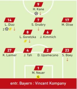 Kimmich casse une ligne sur une passe très inspirée dans l’intervalle pour Diaz qui était rentré à l’intérieur.