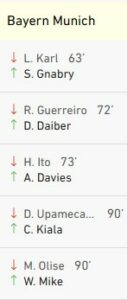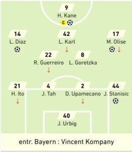 Sur la droite, Olise réussit une bonne passe vers Stanisic, qui centre en retrait pour la tête à bout portant de Diaz.