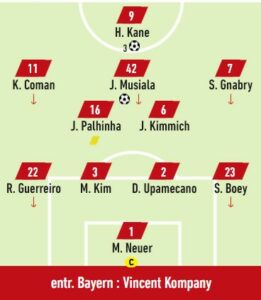 Le Bayern récupère dans sa moitié de terrain à la 44e minute. Longue ouverture de Kim pour Coman sur le côté gauche, le français déborde puis sert Kane à l’entrée de surface. L’anglais ajuste le gardien avec un plat du pied très précis poteau rentrant.