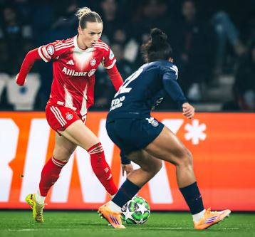 Face à des bavaroises en supériorité physique et tactiquement un ton au dessus des parisiennes, le PSG a une fois encore dû s’incliner face au FC Bayern (en photo, toute la détermination bavaroise avec Franziska Kett)