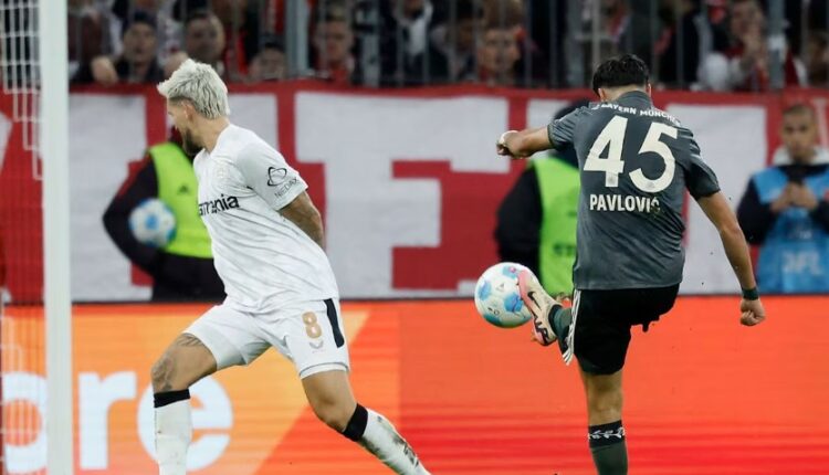 Alexander Pavlovic aura été l’homme du match hier soir. D’abord en manquant sa remise en retrait vers Manuel Neuer, amenant le corner qui allait permettre au Bayer d’ouvrir le score contre le cours du jeu et sa seule occasion (Andrich 30ème) … Puis en marquant un but sublime des 25 mètres. Contrôle de la poitrine puis enchainement par une reprise de volée (Cf photo) en pleine lucarne, Lukas Hradecky qui ne pouvant qu’effleurer le ballon…