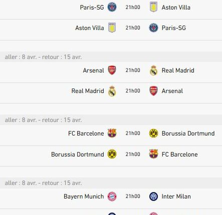 PSG/Aston Villa – Barcelone/Dortmund – Arsenal/Réal Madrid – Bayern/Inter Milan