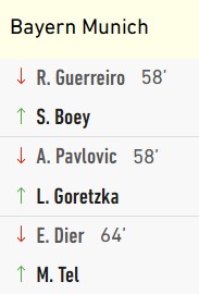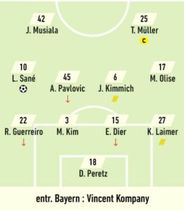 Belle face de jeu Munichoise avec des joueurs de Mayence légèrement léthargiques. Olise décale Kimmich qui frappe. Le ballon est contré et atterrit dans les pieds de Sané qui vient réduire le score à la 87e minute. 2 – 1 !