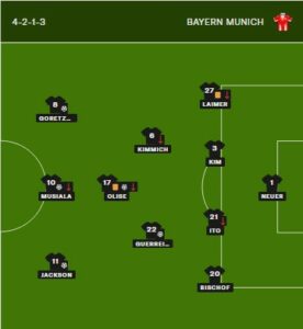 Mauvaise relance du portier local Kimmich récupère transmet à Guerrero qui décale Musiala juste sur sa gauche..