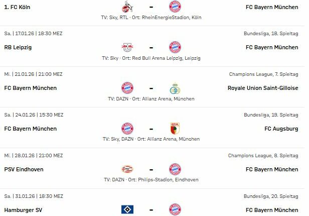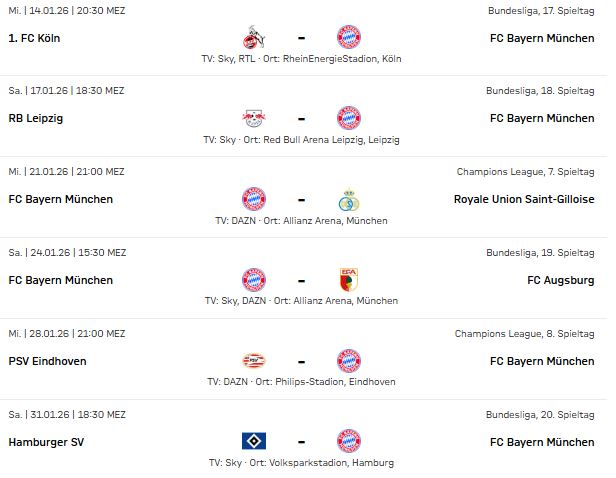 Entre le 11 01 2026 (hier) et le 31 01 2026, le FC Bayern jouera 7 matchs, soit une rencontre tous les 3 jours.