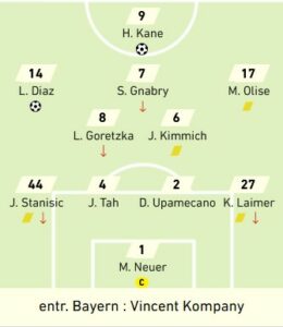 Entrée surface, Kimmich écarte à droite pour Olise qui frappe sans contrôle, fort et en angle fermé.