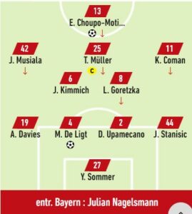 13è, festival de Musiala dans la surface qui oublie de décaler Choupo pour l’ouverture quasi assurée du score.