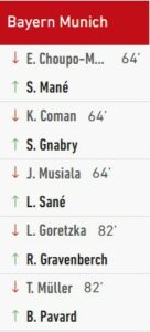 19è, Davies, côté gauche, centre en retrait vers Goretzka qui reprend sans contrôle du gauche à l’entrée de la surface directement dans les gants Bredlow qi capte sans soucis.